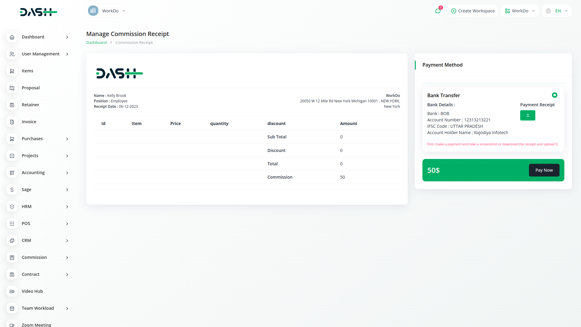 In Commission Module, Commission calculation is about Invoice, Sales Invoice, Project , project and task, agent will get his Commission when payment is made, bank transfer payment in Commission module. When the payment is made, the bank shows its entry in the transfer request so that it knows how much commission is paid.